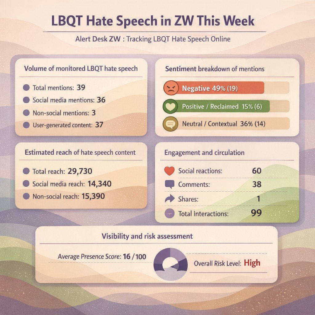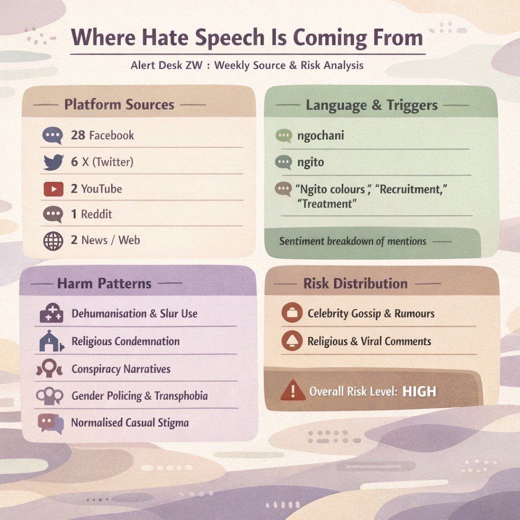 Welcome to Alert Desk ZW, a real-time monitor tracking the life cycle of hate speech in Zimbabwe. Watch how it starts, where it travels, and how quickly it gains dangerous acceptance. This dashboard archives the evidence of online harm-so we can see it, understand it, and stop it. This data will be shared weekly, see live mentions to learn more. To see live mentions as they appear check out the feed. Alongside this tool FVZ presents a desk of research, knowledge products and resources to help all the gays and girls navigate security online.